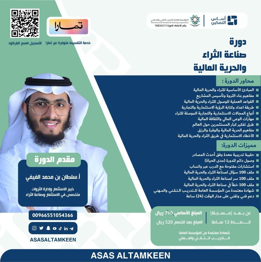 الآن حان الوقت لتبدأ الطريق الصحيح مع دورة صناعة الثراء والحرية المالية تقديم أ. سلطان بن محمد الفيفي، مدرب معتمد وخبير في الاستثمار وريادة الأعمال.