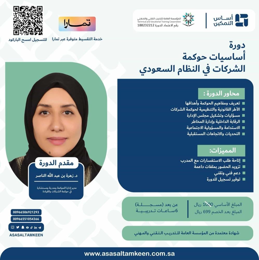 ابدأ الآن مع الدورة التدريبية المعتمدة "أساسيات حوكمة الشركات في النظام السعودي" بقيادة د. زهرة بنت عبد الله الناصر، وتعرّف على أحدث المعايير واللوائح في بيئة الأعمال السعودية